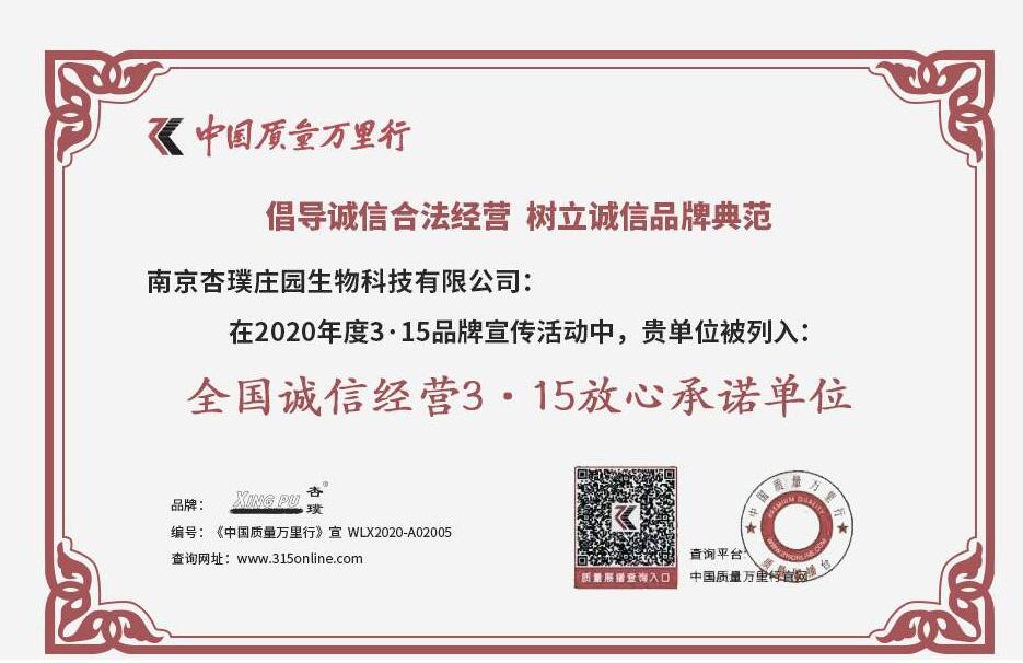 为进一步弘扬“以诚取信”的经营理念,营造信用社会环境,树立诚信典范。以“重质量·讲诚信·树品牌”为宗旨的《中国质量万里行》,在全国范围内开展了2020年大型宣传倡议评选活动。在2020年3月15日,我们迎来了第37个国际消费者权益日。母婴健康品牌杏璞(全称“南京杏璞庄园生物科技有限公司”)凭借其匠心品质、优质服务和良好口碑荣获2020“全国诚信经营3·15放心承诺单位”。