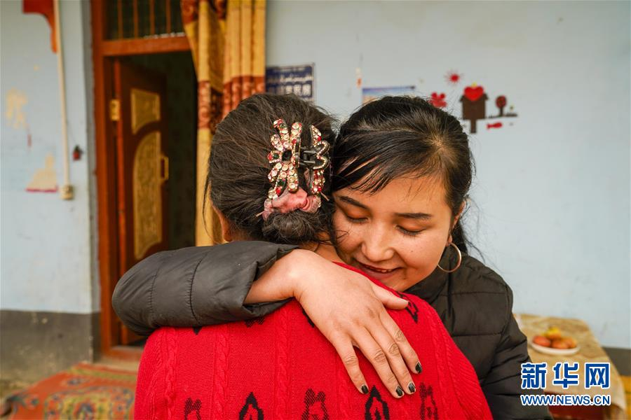 临行前,布再乃普·阿卜来海提(右)在和田墨玉县的家中拥抱自己的母亲(3月26日摄)。