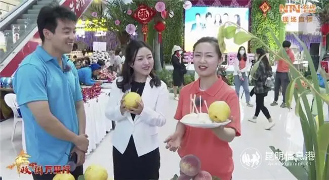 直播活动中,呈贡区人民政府副区长王丹走进直播间,为家乡代言,并和斗南街道相关负责人、花卉创业优秀代表一道向网友推介斗南花卉小镇,推介花卉、蔬菜、梨膏等农特产品及特色美食、花卉文创产品,讲述丰收故事,与主播一起品尝丰收硕果,共话丰收。