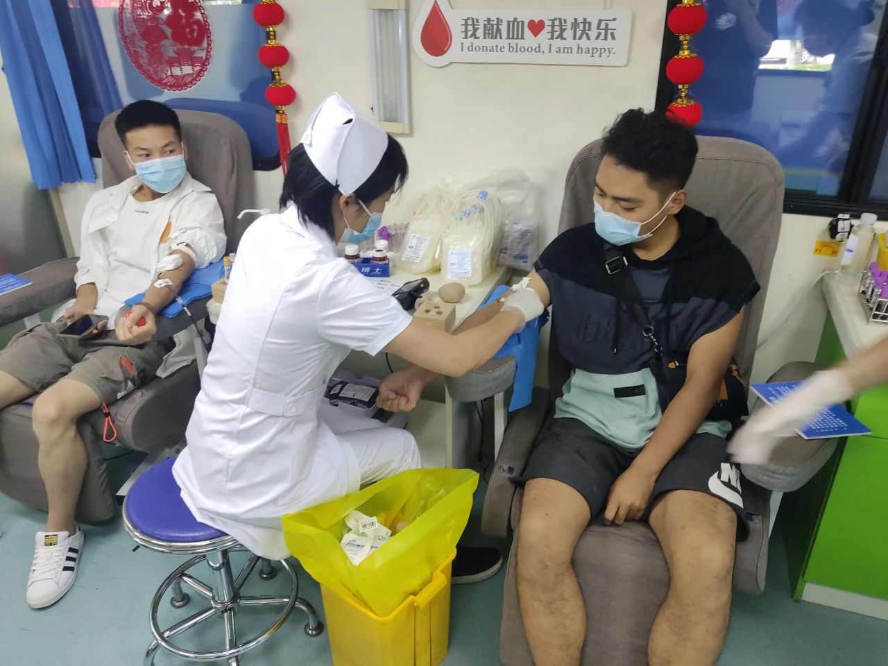 因活动前期各单位踊跃报名,献血点特地增配一辆献血车,采取分时段错峰采血。炎炎夏日,为保障人员健康安全,献血车内采取空气消毒机全天循环工作,献血点添置有免洗消毒液、食品糖水、纸巾折扇等物品,方便献血者使用。此外,采血点还提供有免费义诊、按摩等服务,让献血者们在献血过程中安心、舒心。