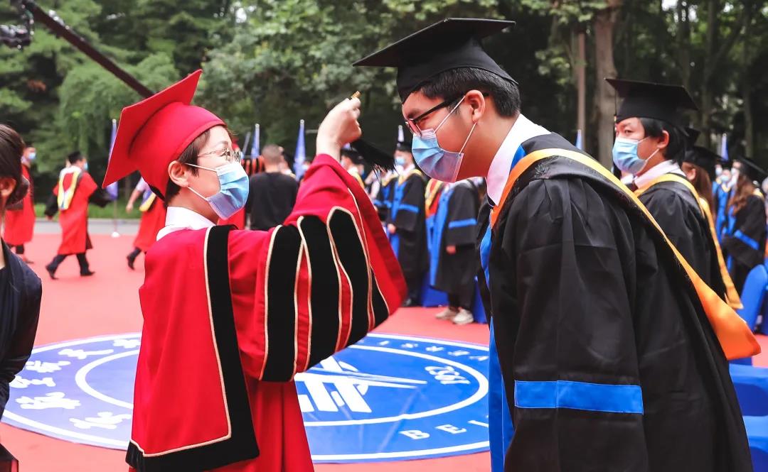 今天的典礼上,拨穗方式也相当特别,校园里,北航老师走到学生中间,为他们拨动流苏,而未能返校的学生则邀请家长拨穗正冠,实时回传的画面,让大家在屏幕上同框。
