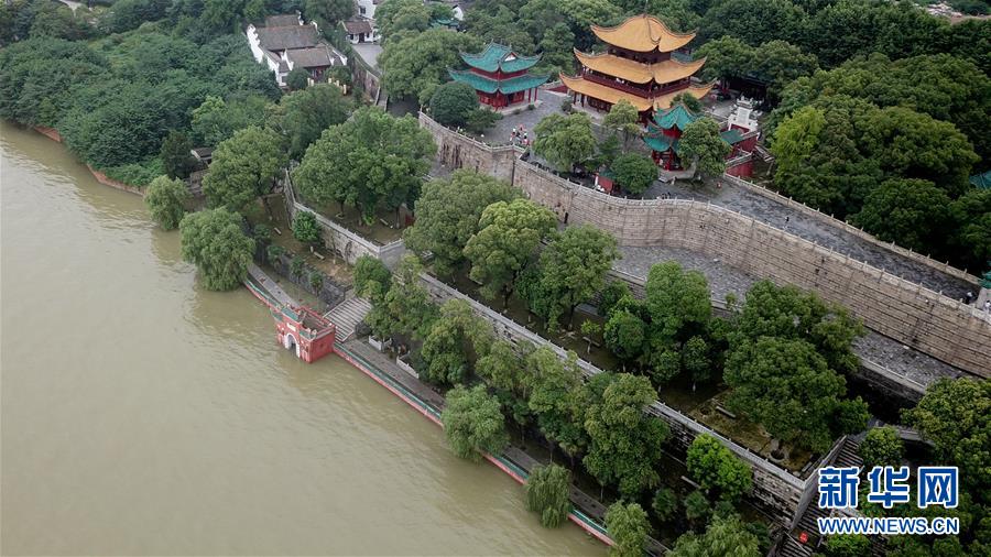7月13日,岳阳楼景区的“点将台”(左下)被洞庭湖湖水浸泡(无人机照片)。 近日,受上游来水持续加大和长江洪水顶托等影响,洞庭湖水位上涨,导致湖南省岳阳市的岳阳楼景区部分景点被淹。目前,岳阳楼景区已限制游客数量,封闭相关路口,并通过广播提醒游客注意安全。 新华社记者 陈泽国 摄