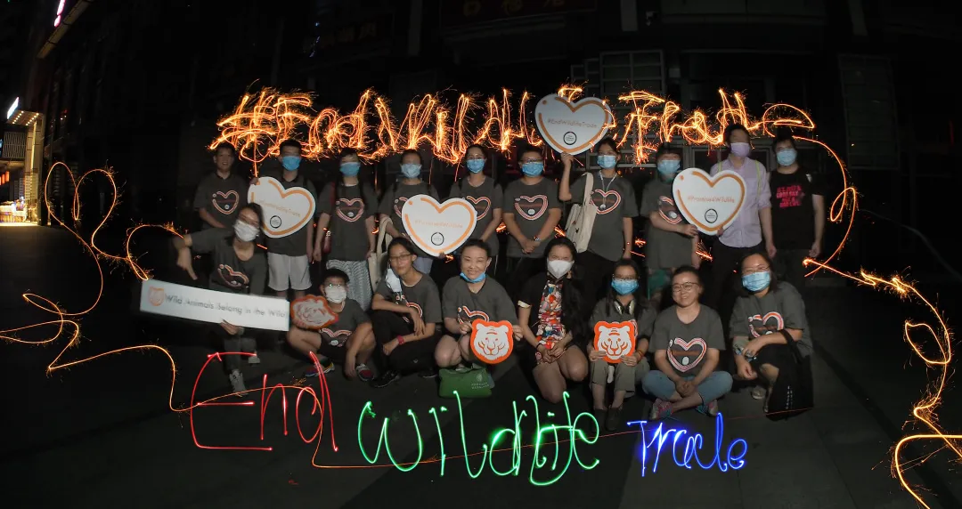在活动的最后,所有参与者与#EndWildlifeTrade#的光绘标语合影留念,为本次的活动画上了一个温馨的句号。请与我们一起保护野生动物,支持野生动物商业贸易禁令!