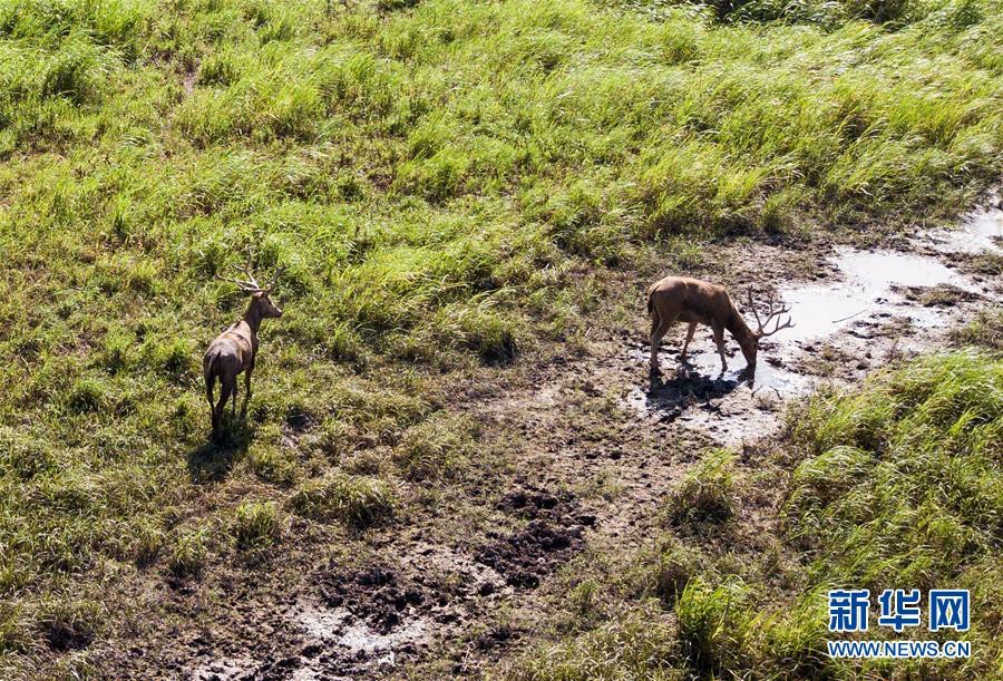 这是8月7日在东洞庭湖麋鹿和鸟类救治避难中心拍摄的麋鹿(无人机照片)。 位于湖南省岳阳市的东洞庭湖麋鹿和鸟类救治避难中心成立于2016年9月,占地400余亩,中心自建成后就承担起东洞庭湖区域全部麋鹿的救援、医治、康复和喂养任务。目前该中心共有14只麋鹿正在接受救助。 新华社记者 李鑫 摄