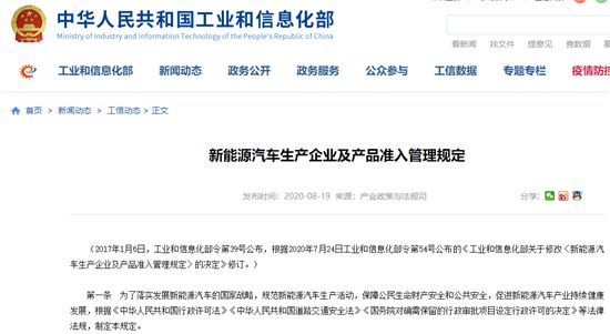 19日,工信部正式发布了修改后的《新能源汽车生产企业及产品准入管理规定》(以下简称“规定”)。《规定》删除了包括第五条以及《新能源汽车生产企业准入审查要求》等附件中有关“设计开发能力”的相关内容;将新能源汽车生产企业停止生产的时间由12个月调整为24个月;删除了有关新能源汽车生产企业申请准入的过渡期临时条款。《规定》将自2020年9月1日起施行。