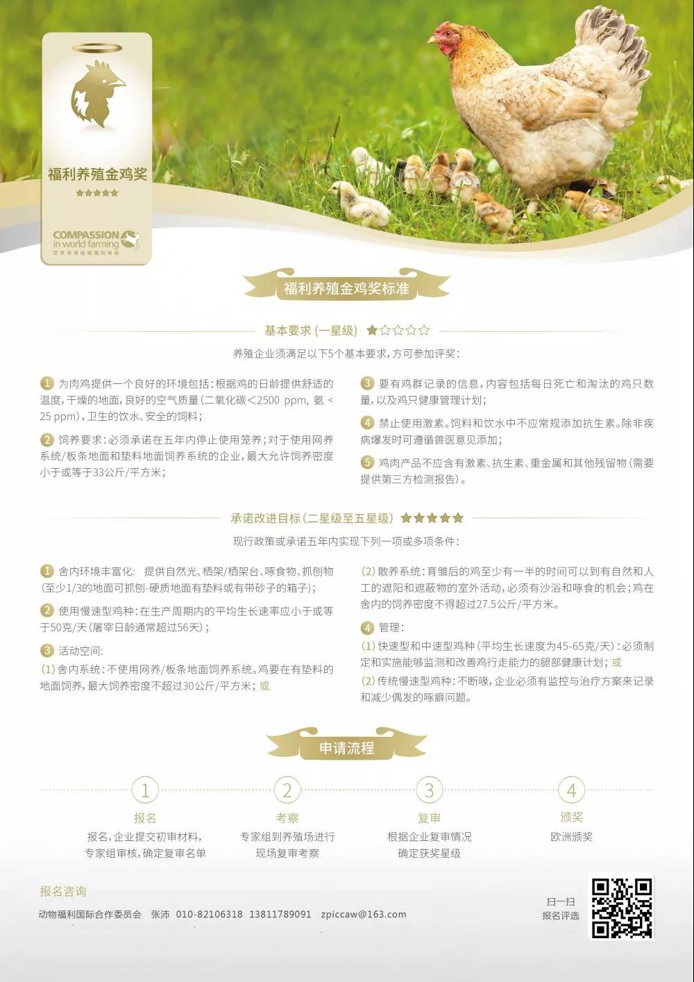 福利养殖金鸡奖:舍内生产系统不低于20000只肉鸡,散养生产系统不低于3000只肉鸡;