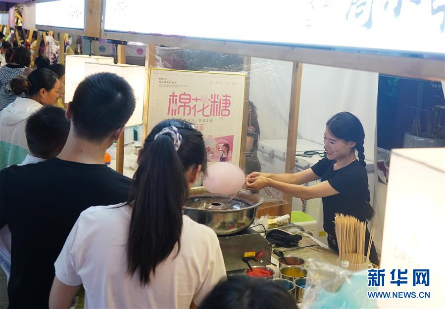 9月11日,市民在宿迁市宿豫区筑梦小镇“筑梦市集”上购买小吃。