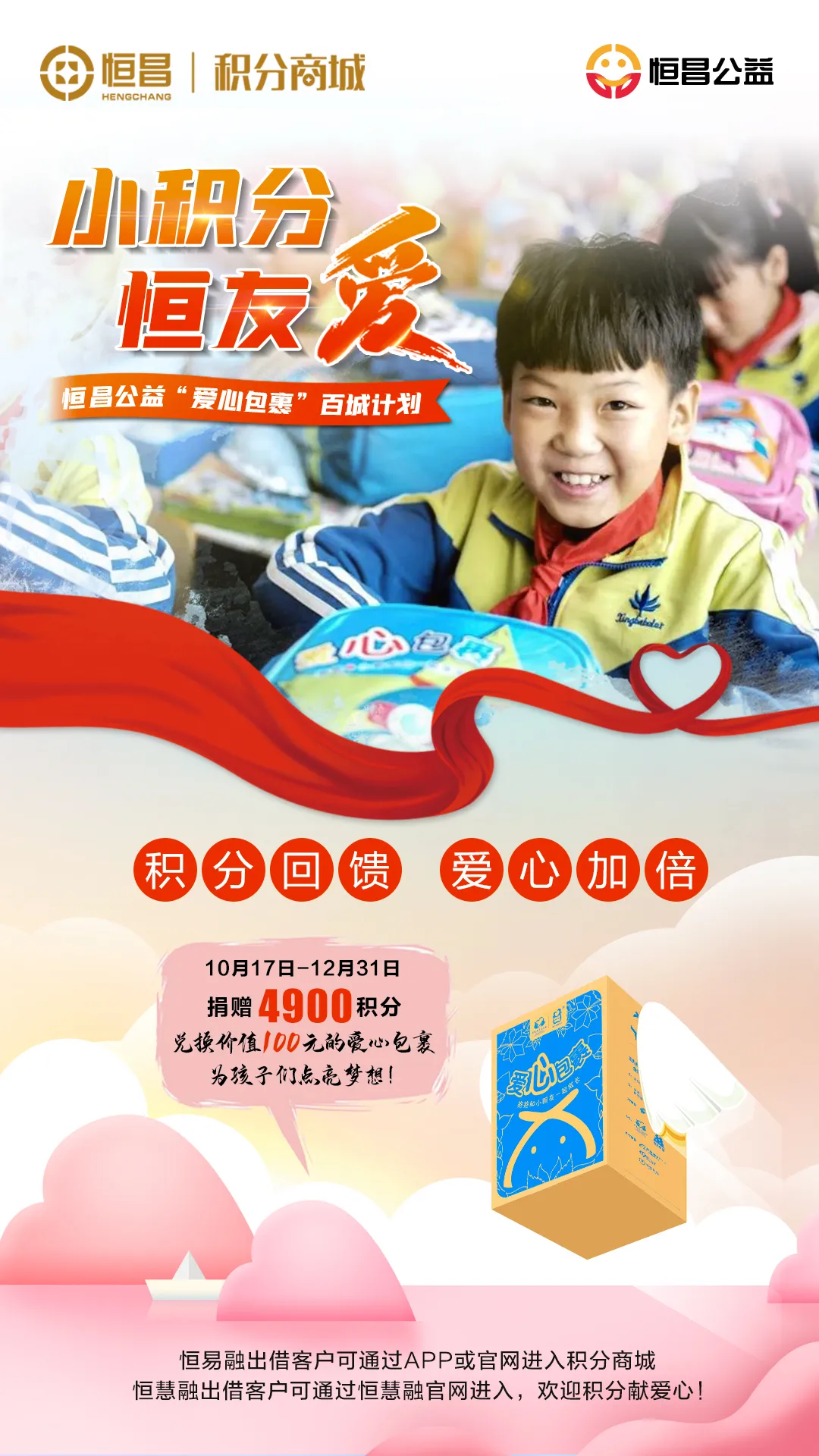 聚焦教育扶贫,让教育力量持续发力。“小积分 恒友爱”爱心包裹百城计划由恒昌提供爱心平台,倡导高净值客户以线上“积分商城”投资累计的积分,支持中国扶贫基金年会发起的“爱心包裹”项目。据了解,爱心包裹项目是在国务院扶贫办的指导下,由中国扶贫基金会在2009年共同发起的一项全民公益活动,活动致力于改善贫困地区农村小学综合发展和生活条件。高净值客户凡是积分满4900分,即可参与恒昌公益“小积分 恒友爱”爱心包裹百城计划。活动中,价值49元的4900分积分可兑换价值100元的美术包“爱心包裹”,小积分加倍爱。高净值客户在捐献爱心后也将获得电子捐赠感谢卡“回音卡”,活动同时将通过一系列线上互动让更多力量加入到系列爱心慈善行动之中。