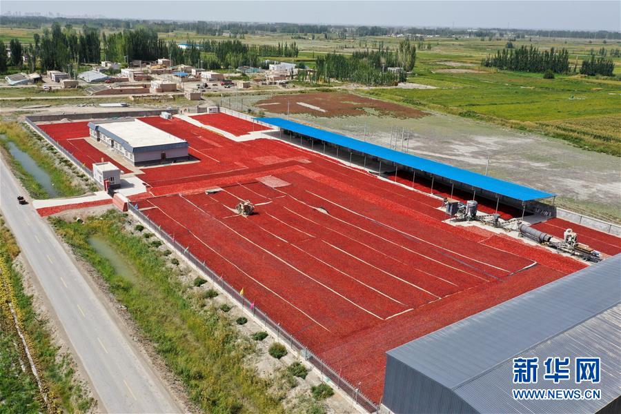 这是9月1日拍摄的新疆博湖县塔温觉肯乡东大罕村辣椒晾晒场(无人机照片)。 进入夏秋两季以来,天山南北的广袤土地上硕果累累,粮食瓜果次第丰收,各地一派繁忙的景象。 新华社记者 丁磊 摄