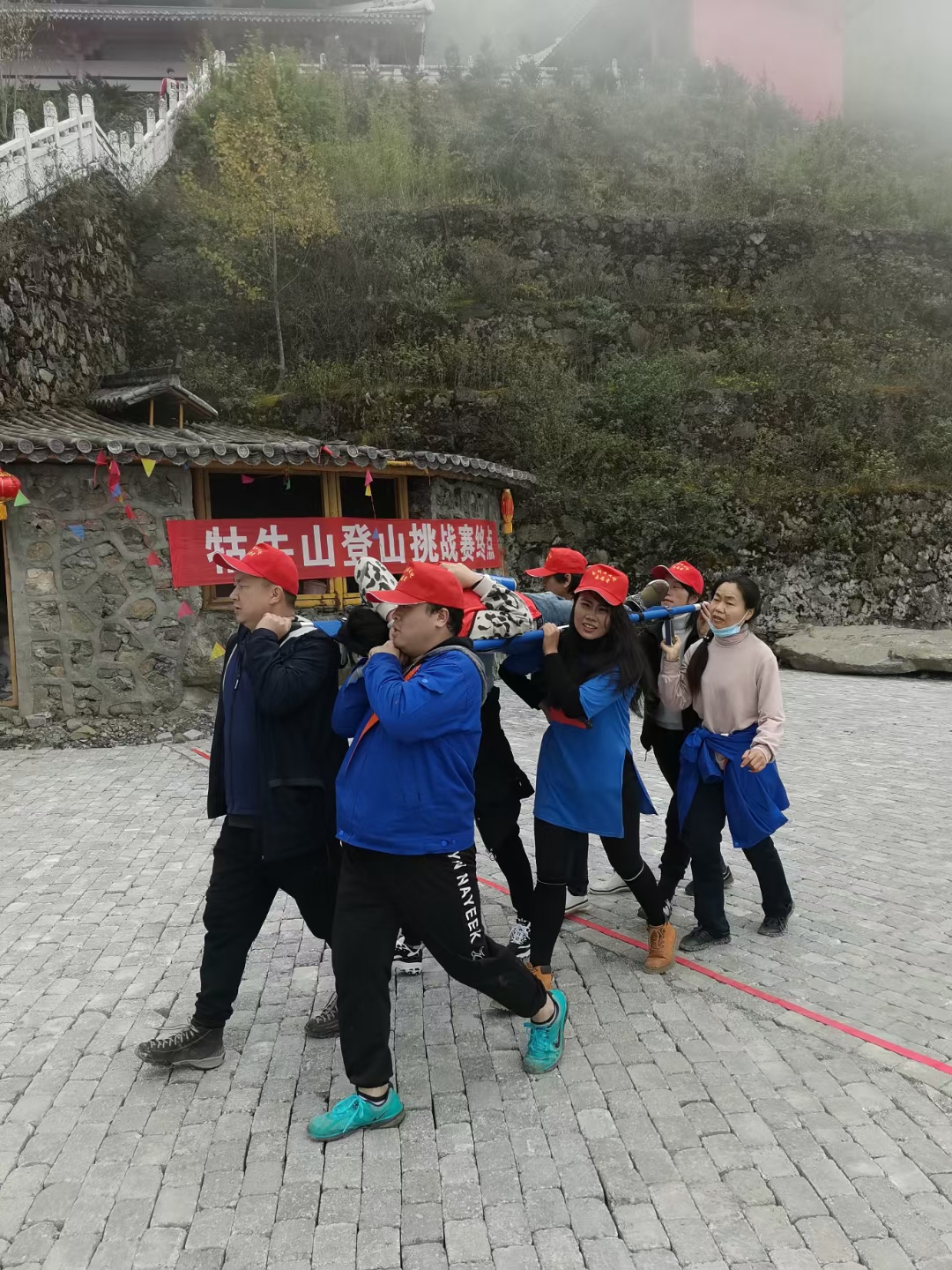 11月8日上午9时许,108名徒步活动参与者从石板房村箐口村出发,从雄、奇、险、峻的牯牛山山脚出发。身着各色服装的徒步队伍迈着矫健的步伐行走在陡峻的山道上,为初冬的牯牛山添上了一抹温暖的色彩。徒步路线全长7公里,经过宇宙中最高海拔的道冠一一紫霞宫著名的四十九道弯,世人称为“美丽的魔鬼公路",终点为海拔3500余米的紫霞宫,徒步活动沿途设置有补给点、饮用水供应点、医疗点、伸展游戏互动关卡。除此之外,还设有太极拳文化推介、东川特色旅游资源及农副产品展示等活动。