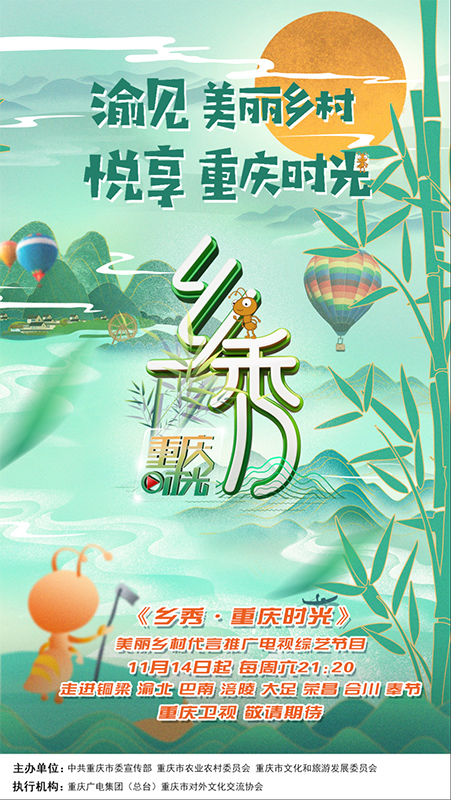 中国网11月12日讯 近日记者获悉,由重庆市委宣传部、市农业农村委、市文化旅游委主办,重庆广电集团(总台)、重庆市对外文化交流协会执行的美丽乡村推广代言综艺节目《乡秀·重庆时光》将于11月14日起登陆重庆卫视920黄金档首播,每周六21:20定档周播。