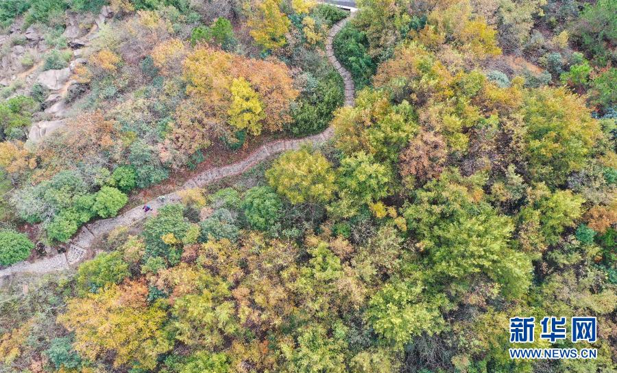 11月28日,游人在白马涧生态园游玩(无人机照片)。位于江苏苏州高新区枫桥街道辖区内的白马涧生态园,是一片原生态“绿肺”。冬日里的白马涧生态园五彩斑斓,景色迷人。新华社记者 季春鹏 摄