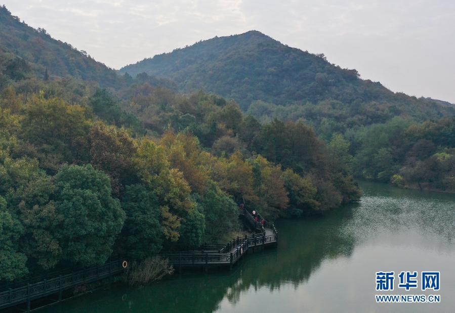 11月28日,游人在白马涧生态园游玩(无人机照片)。位于江苏苏州高新区枫桥街道辖区内的白马涧生态园,是一片原生态“绿肺”。冬日里的白马涧生态园五彩斑斓,景色迷人。新华社记者 季春鹏 摄