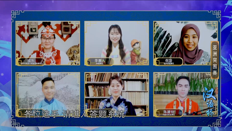 “推诚相见、见贤思齐、齐头并进、进退裕如、如坐春风、风月同天、天下一家”,亚洲六强选手在“云端”用成语接龙和作揖的方式,表达参加“汉语桥”的感受。现场,朱迅携评委和“加油团”,以标准的作揖进行回礼,并向选手们送上了“大鹏一日同风起,扶摇直上九万里”的真诚祝福。