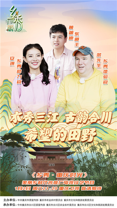 美丽乡村代言推广电视综艺节目《乡秀·重庆时光》第七站合川,将于1月2日在重庆卫视21:20黄金档播出。本站,东道主黄伽迪邀请热爱重庆美食的美女主持安琪,与吃货老朋友“笨大叔”一起,在三江秀水的见证下,开启在古韵合川的旅程,一起见证合川新变化!