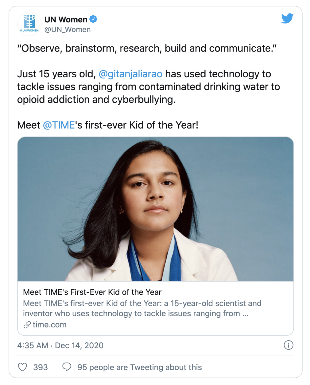 15岁的科学家和发明家Gitanjali Rao被《时代》周刊评选为有史以来第一个 "年度最佳儿童"。
