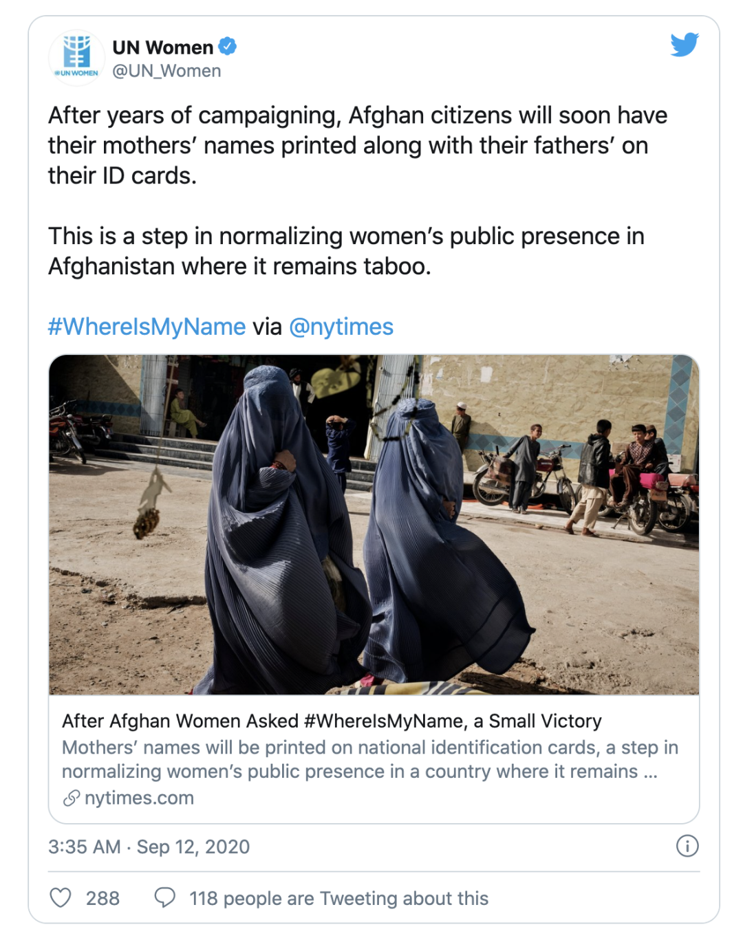 这项新法律是在长达数年的 "#我的名字在哪里#(#WhereIsMyName) "的社交媒体运动后出台的,该运动倡导阿富汗妇女的权利与赋权。