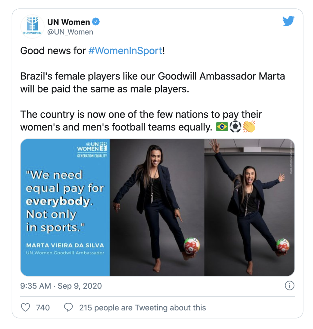 在塞拉利昂,同工同酬的承诺包含了国家女子足球队的出场费和比赛获得的奖金。同样,在巴西,女性国家球员在备战期和比赛中的报酬将与男性国家球员相同。