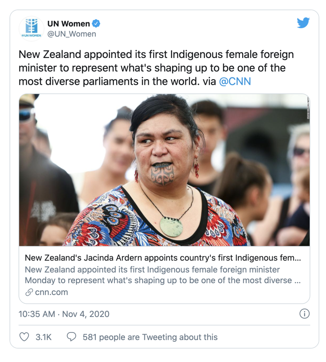 11月,Nanaia Mahuta成为第一位被任命为新西兰外交部长的原住民妇女。Mahuta是毛利族人,1996年首次当选为议员。她曾作为第一位在下巴上纹有moko kauae(传统纹身)的女议员创造了历史。