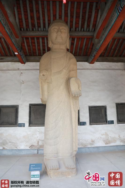 北周释迦立像高450厘米,佛像面部半圆,鼻梁高挺,大耳垂肩