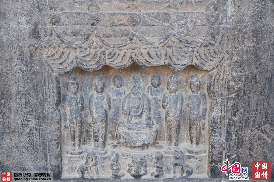 四面造像碑下部佛龛一佛二菩萨二弟子像二胁侍像