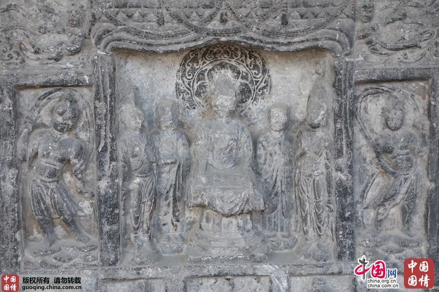 唐久视元年廉德琮等造像碑身上半部分雕释迦说法图佛龛,两边各雕一力士