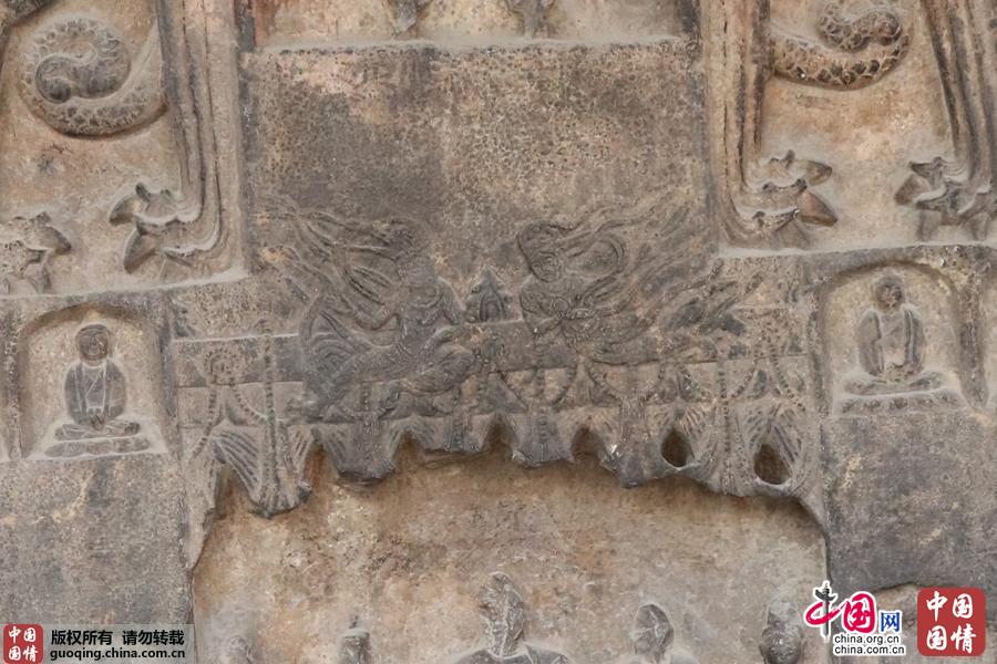 唐垂拱二年智珉造像碑佛说法像龛龛楣雕飞天两躯