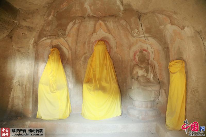 第二十一窟北壁原有一组一佛二菩萨雕塑群