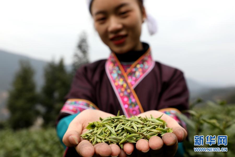 1月29日,广西三江侗族自治县良口乡良帽村一名侗族姑娘展示采摘的早春茶。