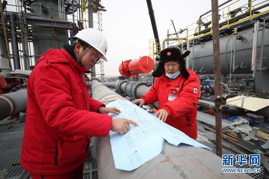 2月3日,在辽河油田双台子储气库群一期工程现场,来自湖北孝感的工程技术人员刘单明(左)和同事在现场工作。今年他留在施工现场过年,确保工期目标如期完成。