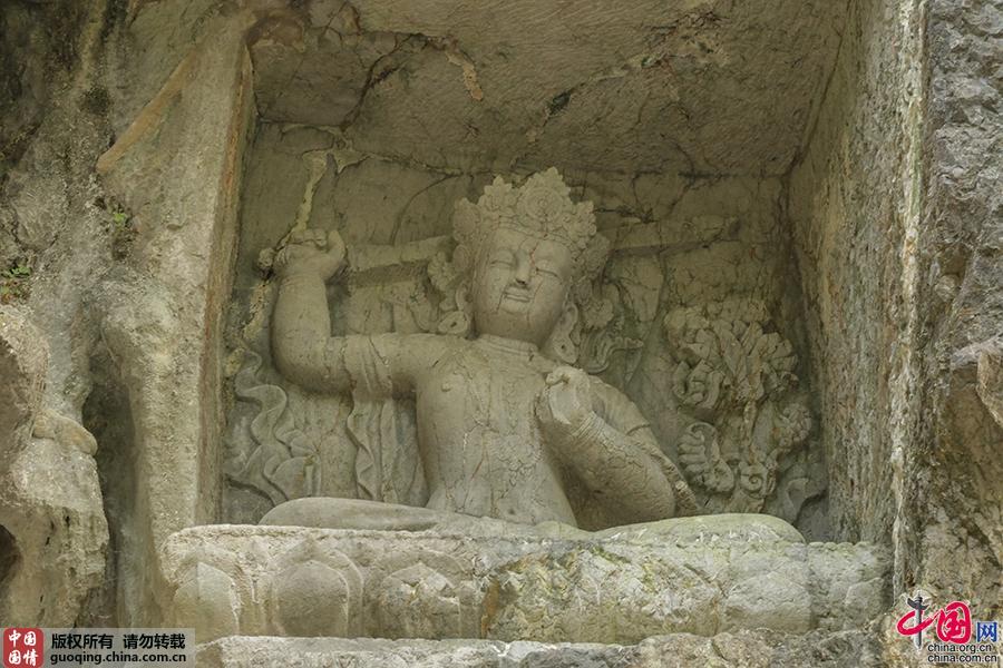 文殊菩萨坐像 元代 在通天洞“一线天”题记右侧,龛高225厘米,宽165厘米,平顶,文殊菩萨坐像高160厘米,天女形,右手握剑,高举过肩,这是一龛元代梵式造像