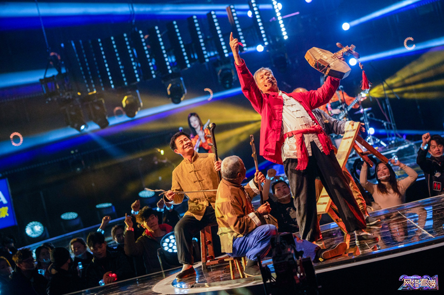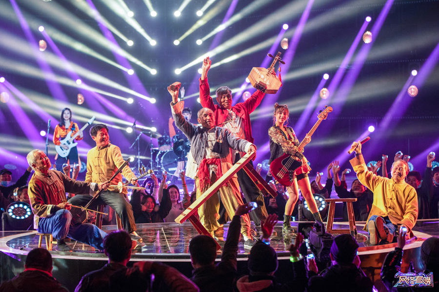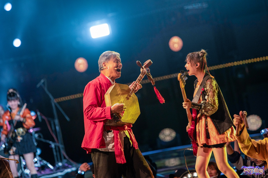 “这样的搭配是怎么想的?”“你永远不知道网晚能折腾出什么新花样!”网晚极具创意的梦幻联动设计给观众带来了如同“开盲盒”一样的十足惊喜,收获了诸多惊叹与好评。其中,被称为“中国最早摇滚”的非物质文化遗产华阴老腔传承人与新锐女子摇滚乐队844乐队同台嗨唱更是在网络上掀起一番惊艳浪潮。这两个看似遥不可及的组合,在网络春晚的舞台上被创意性地联系在了一起,首次合作的他们可称得上天衣无缝!更被观众点赞称为“两代摇滚人的合体”“华阴老腔的高亢与磅礴像一个老者托着年轻一代的乐队越登越高!”这种无形中传承融合的色彩让人热泪盈眶。