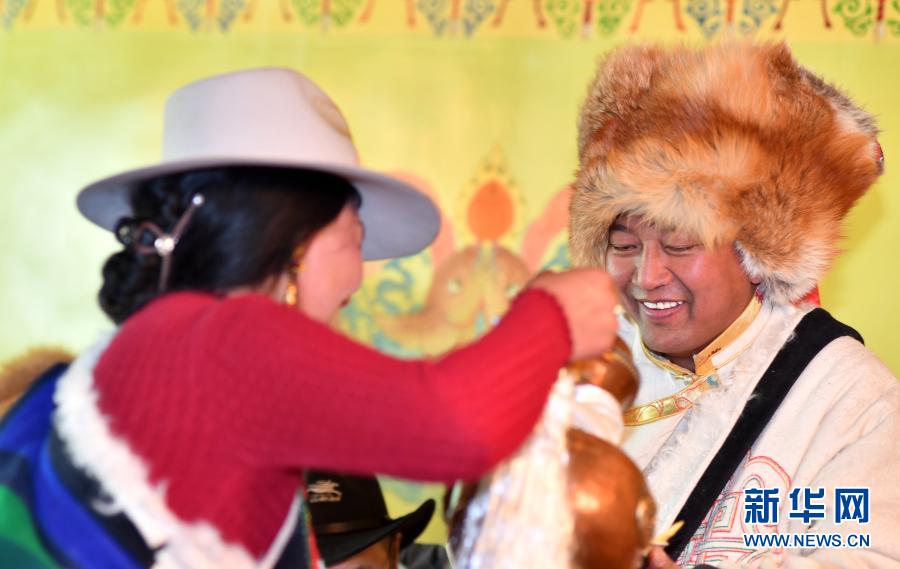 2月12日,拉萨市当雄县牧民互相敬献青稞酒。新华社记者 觉果 摄