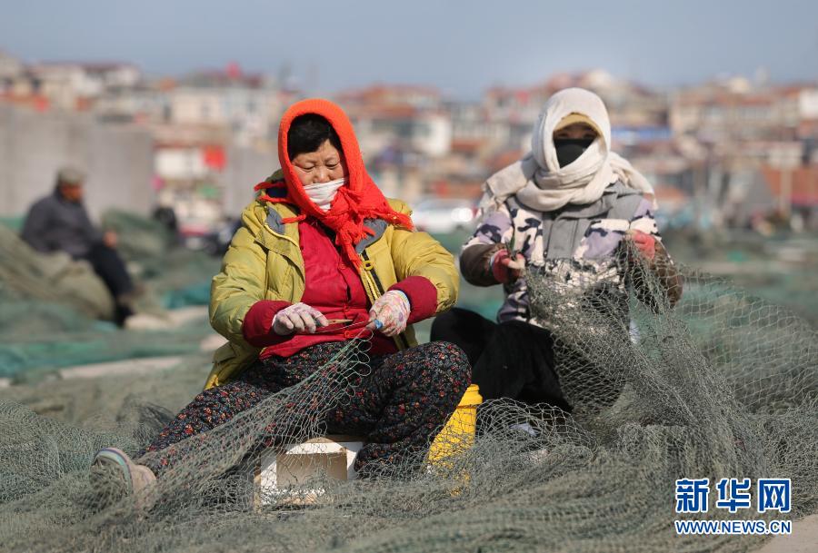 2月19日,江苏省连云港市连岛渔民在修补网具。