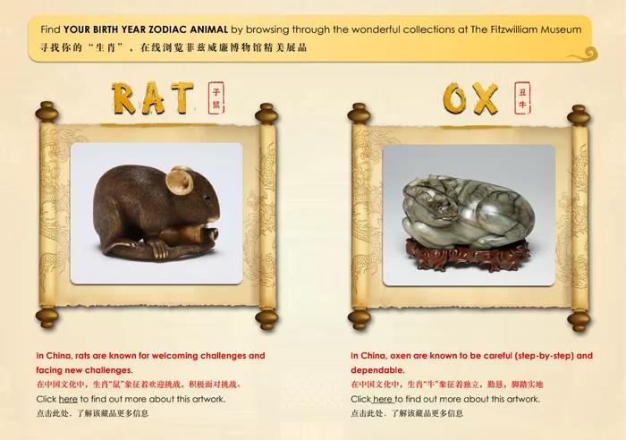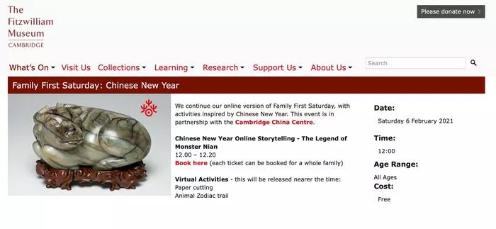 菲茨威廉博物馆于今年2月6日举办线上春节“亲子日”活动,并加入英国“欢乐春节”活动的大家庭。内容包括:中国故事会,讲述“年兽的故事”;生肖寻宝,用馆藏珍品讲述12生肖的故事;以及手工课,讲解如何制作“小牛”灯笼等。所有内容都在博物馆官网保存至2月底,供观众随时重温。