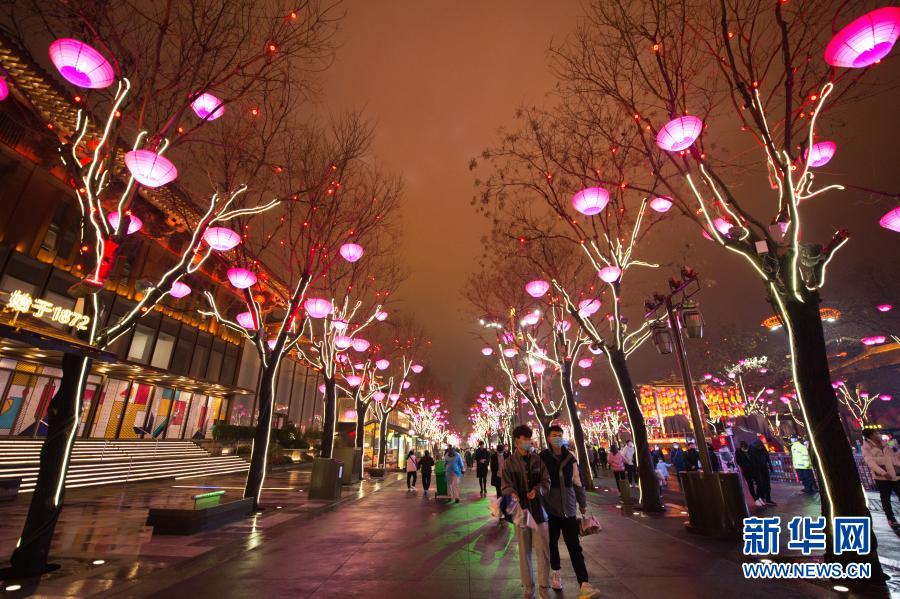 随着元宵节临近,西安大唐不夜城步行街摆出了庆祝节日的彩灯,前来参观的市民和游客络绎不绝。