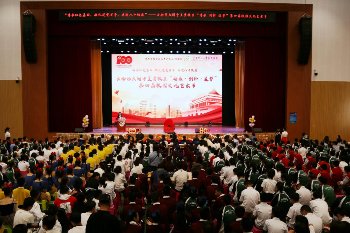 4月13日上午,记者走进云南师范大学附属中学呈贡校区,校园展示墙上一幅幅设计精美、独特、新颖的艺术节海报吸引了注意力。校园内,一群群脸上洋溢青春气息,身着表演盛装的同学匆匆穿过操场奔向音体馆。 9:00,云南师大附中呈贡校区音体馆响起了柔美的歌声,“我来唱一首歌,古老的那首歌。我轻轻地唱,你慢慢地和。是否你还记得,过去的梦想。那充满希望灿烂的岁月,你我为了理想,历尽了艰苦。”“传承红色基因、献礼建党百年、共迎八十校庆”云南师大附中呈贡校区第四届“传承、创新、追梦”校园文化艺术节在校园合唱团的合唱声中拉开序幕。