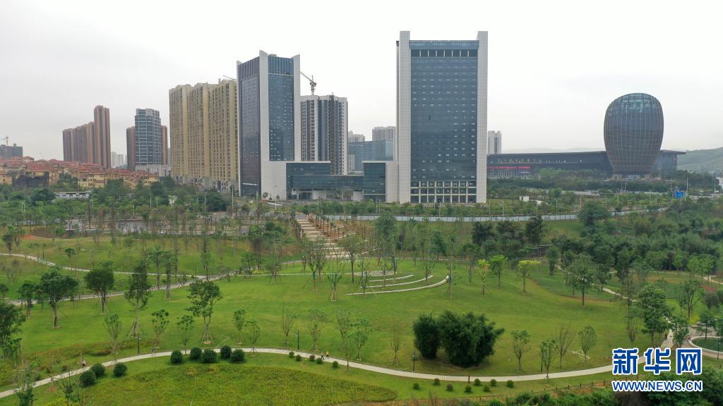 5月4日,游人在广西柳州市柳东新区滨江生态公园里散步(无人机照片)。新华社发(黎寒池 摄)