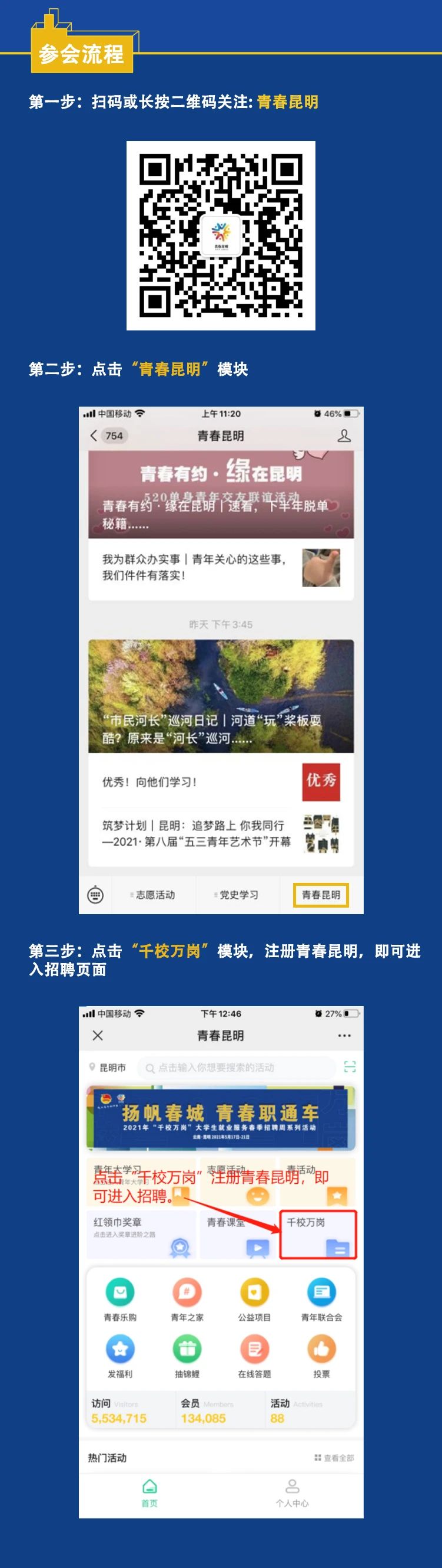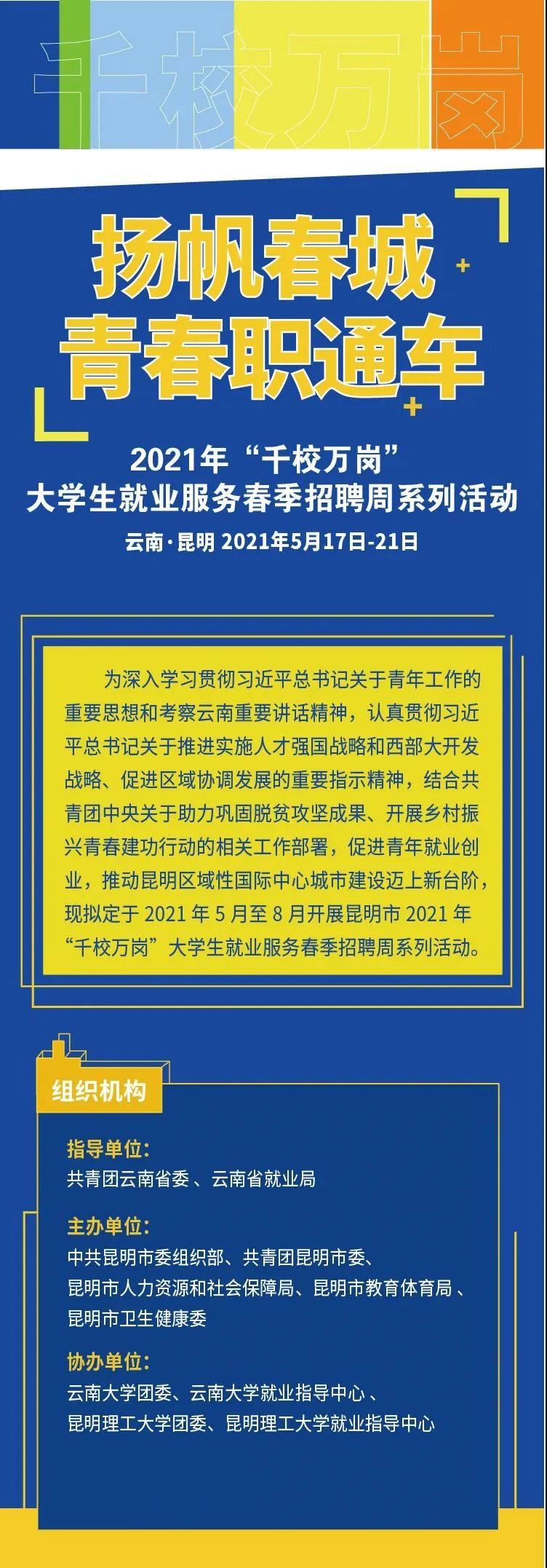 为更好地服务青年就业创业,为企业和青年搭建双向选择桥梁,由中共昆明市委组织部、共青团昆明市委、昆明市教育体育局、昆明市人力资源和社会保障局、昆明市卫生健康委员会共同举办的昆明市2021年“千校万岗”大学生就业服务春季招聘周系列活动即将开始,线下200+家、线上350+家企事业单位同时招聘。