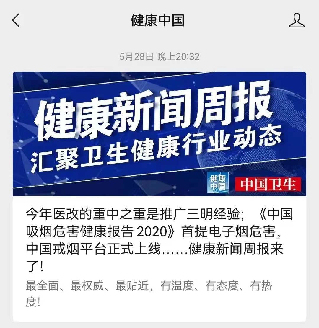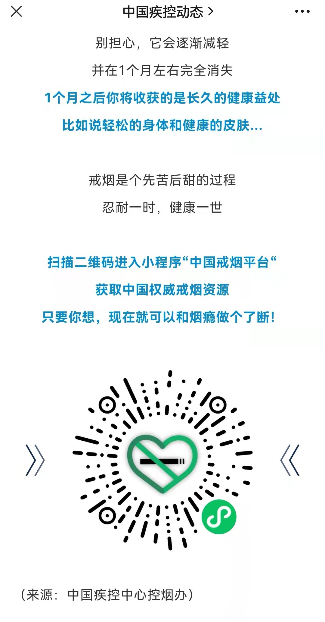 “中国戒烟平台”小程序在国家卫健委“健康中国”微信公众号、中国疾控动态、世界卫生组织等平台推广:
