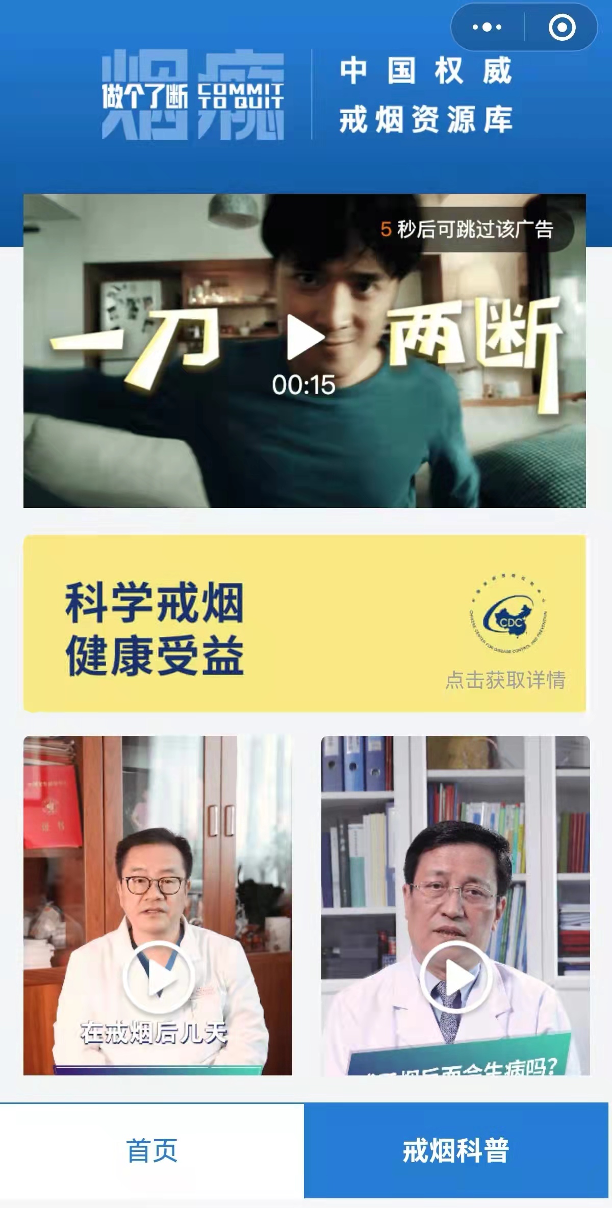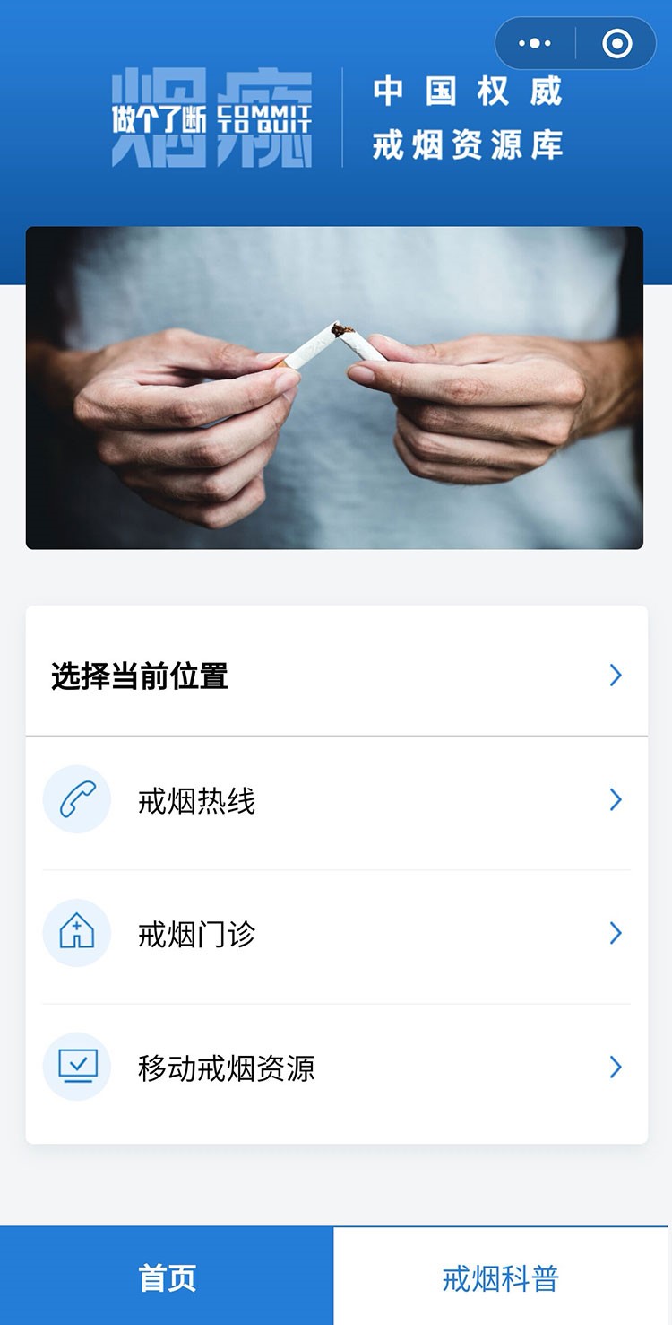 “中国戒烟平台”微信小程序整合了中国31个省级行政区的权威戒烟资源,通过数字化手段,使得多种戒烟服务和资源,如戒烟诊所、戒烟热线、戒烟小程序,以及微信互助群等触手可及,便于吸烟者选择适合自己的、且被证实有效的戒烟服务。此外,“中国戒烟平台”微信小程序还向吸烟者提供了戒烟知识科普,通过戒烟宣传片、医学专家和控烟明星大使录制的短视频,传达了吸烟有害健康的理念。