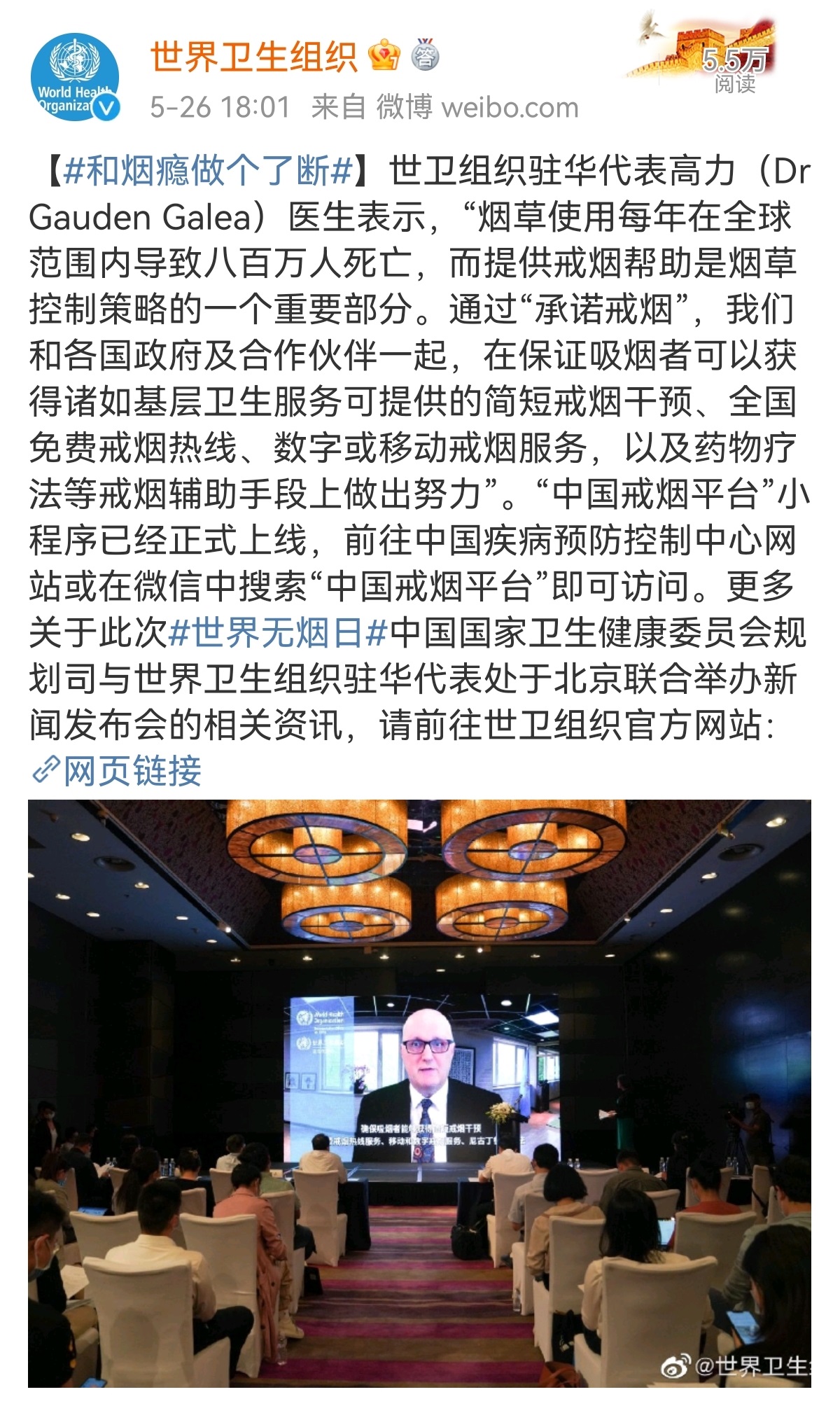 “中国戒烟平台”微信小程序发布后,受到世卫组织及广大网友的一致好评,在世卫组织公众号、微博等平台广泛推广。