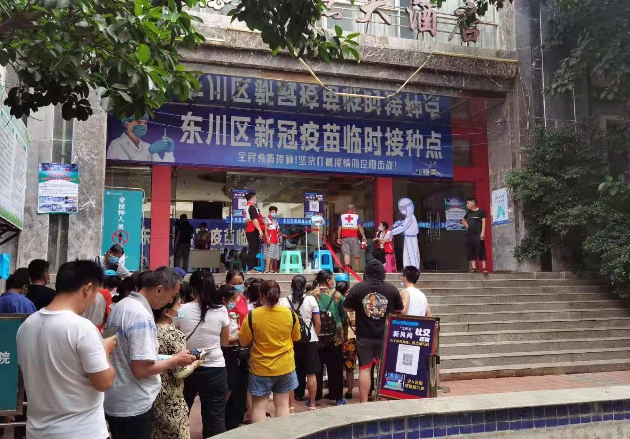 为了让东川市民能够安全、有序、及时的接种上新冠疫苗,加快东川区疫苗接种进度,尽快构筑群体免疫屏障,东川卫生健康局结合党史学习教育活动开启“白加黑”工作模式,努力破解群众反映的疫苗接种点位设置不合理、空间小、排队等候时间长等问题,在全区采取设置固定、临时、移动式疫苗接种点、机动疫苗接种队伍等形式进入边远村组、企业为群众开展疫苗接种;积极协调各方资源及各医疗机构医护人员,建成了东川首个方舱式大型临时疫苗接种点,并积极调运疫苗,保障疫苗的及时供应。该接种点内分有健康预检区、问询登记区、接种区、留观区、接种拍照打卡区等多个区域,标识指引流程清晰。为提升广大群众接种体验感,当天共开放30个登记台,17个接种台,区红十字会配备了10余名志愿者现场协助扫码、登记、维持秩序,全程提供接种引导等服务。并且在留观区还提供食品、饮用水、健康宣教资料,接种体验服务更加便捷、高效、安全、有序。