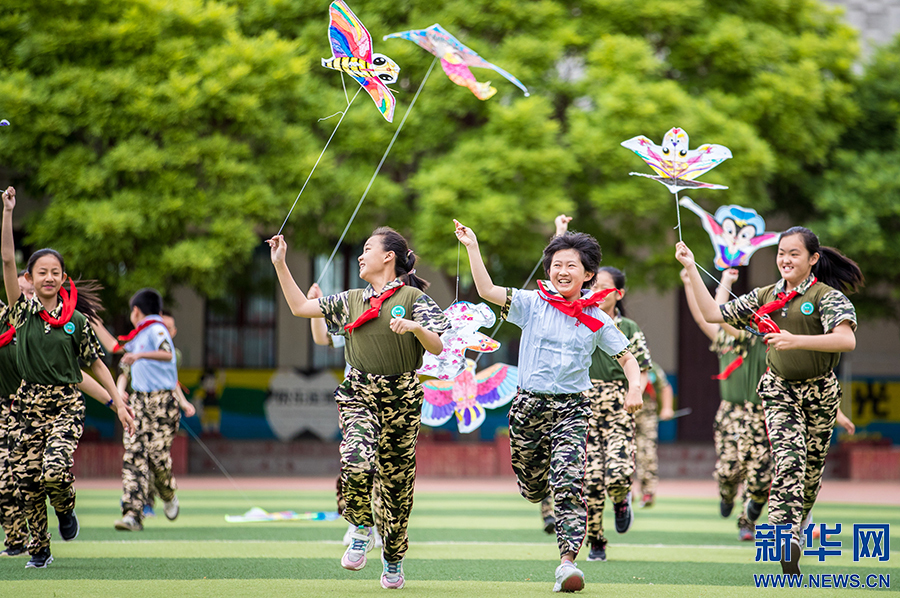 9日,内蒙古自治区呼和浩特市玉泉区五塔寺东街小学学生在放飞彩绘风筝。新华网发(丁根厚 摄)