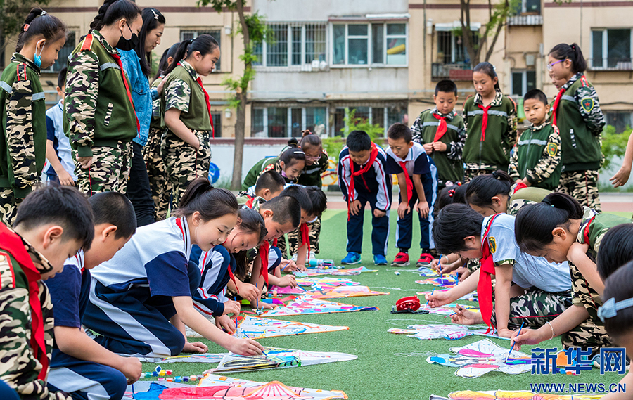 9日,内蒙古自治区呼和浩特市玉泉区五塔寺东街小学学生在彩绘风筝。新华网发(丁根厚 摄)