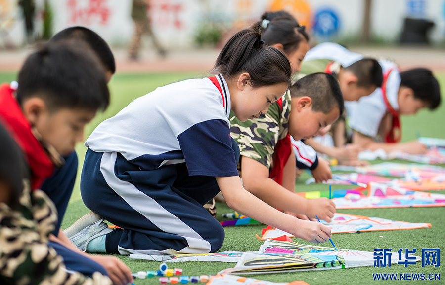 9日,内蒙古自治区呼和浩特市玉泉区五塔寺东街小学学生在彩绘风筝。新华网发(丁根厚 摄)