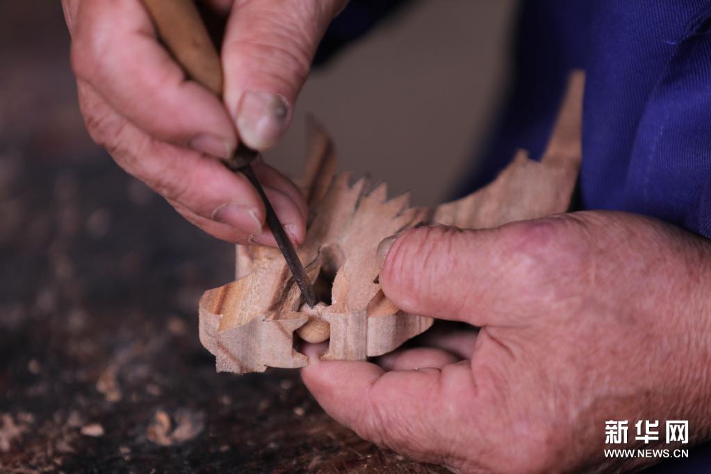 在湖南省永州市道县上关街道水南社区,周承云在作坊里雕琢小龙头龙珠(5月7日摄)。新华社发(何红福 摄)