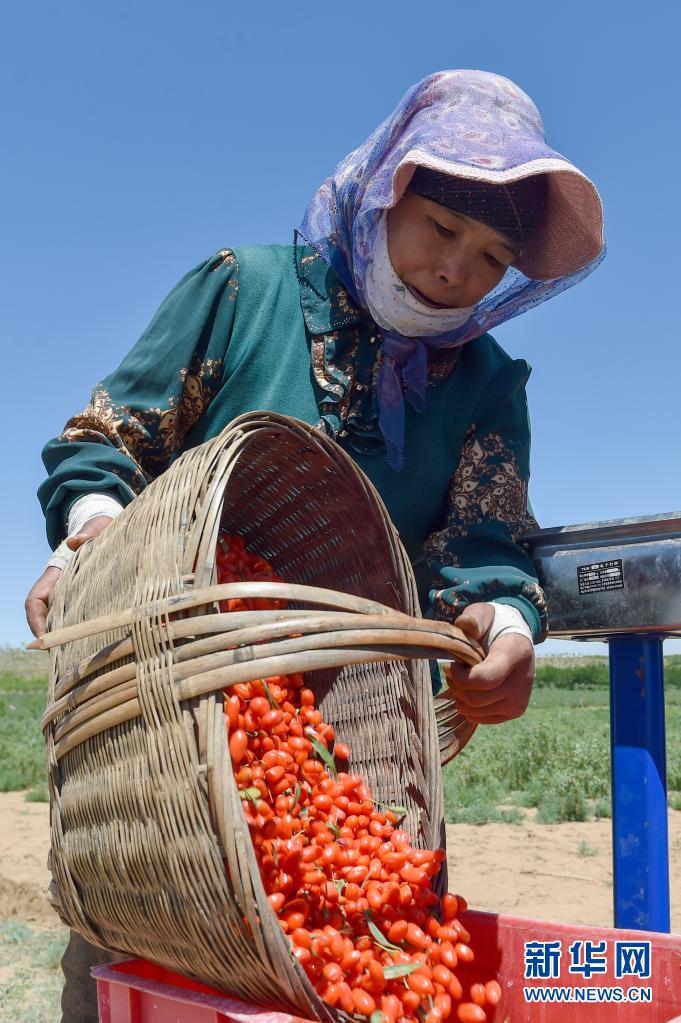 6月17日,工人在宁夏中宁县玺赞枸杞庄园将采摘的头茬枸杞称重。