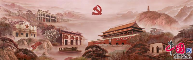 2020年9月,受上海市委宣传部委托,潘鲁生主持开展上海一大纪念馆前厅三幅主题壁画创作任务。创作初期,先后就壁画的主题定位、题材选取、整体风格等问题组织了多次专家研讨会,在交流研讨基础上形成了后期创作的总体思路,以反映中国共产党由小到大、由弱到强,带领全国各族人民取得伟大胜利的历史征程为主线,以红色地标与革命圣地为题材,运用写实与象征的艺术手法进行创作。在深化创作阶段,就画面构图、元素布局、色彩关系展开细致研究和修改,期间数易其稿,形成了最终呈现的画面效果。在壁画制作阶段,经过对材质与工艺的反复实验,结合展馆建设需求,确定了高温烧制工艺。加工制作期间,进一步对画面细节与色彩效果进行现场比对与调整,确保壁画的每一个细节都完美地呈现给观众。