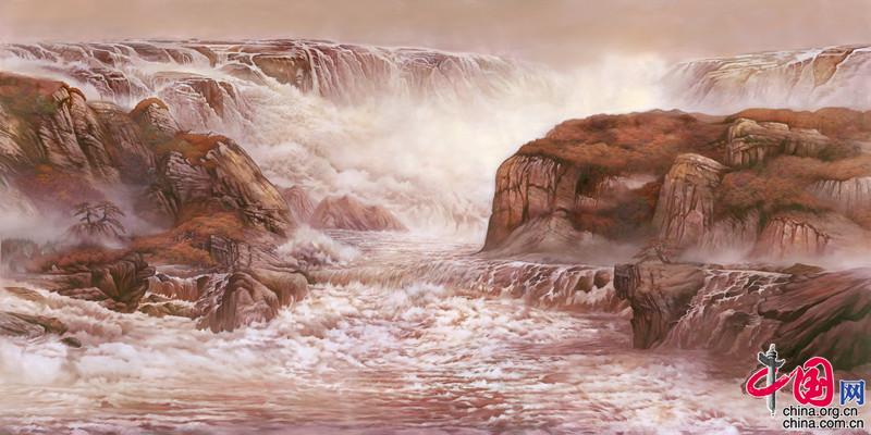 《中流砥柱》以屹立在黄河急流中的砥柱山为主体,喻示党史百年如奔流不息、勇往直前的母亲河,中国共产党带领人民在中华民族伟大复兴历史征程中立潮头、勇担当发挥中流砥柱的作用。